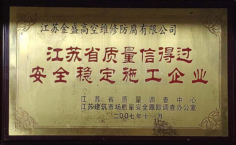 • 2007年江蘇省質(zhì)量信得過安全穩(wěn)定施工企業(yè)